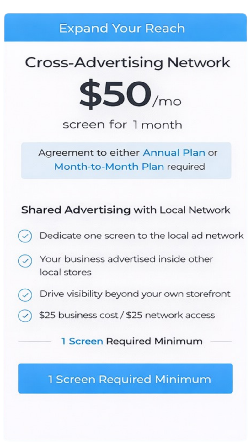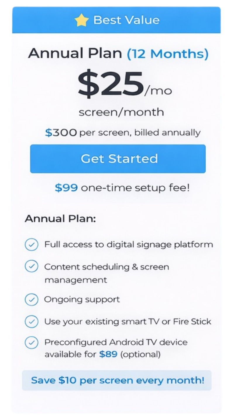 Our goal is to make digital signage simple, affordable, and easy to manage for small businesses, with clear pricing and real value built in.